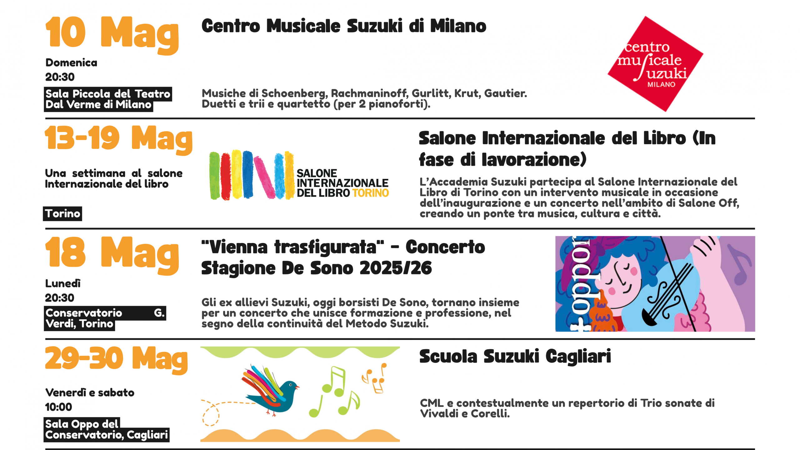 Oggi l’Istituto Suzuki Italiano raccoglie l’eredità di questo lungo percorso, unendo insegnanti, allievi e genitori in una comunità viva e creativa, e celebrando diffusamente su tutto il territorio i 50 anni del Metodo Suzuki in Italia, con una serie di concerti organizzati dalle varie Scuole e Maestri sotto il patrocinio dell’Istituto Suzuki Italiano. Scorri in basso per visualizzare il cartellone con tutti gli appuntamenti.