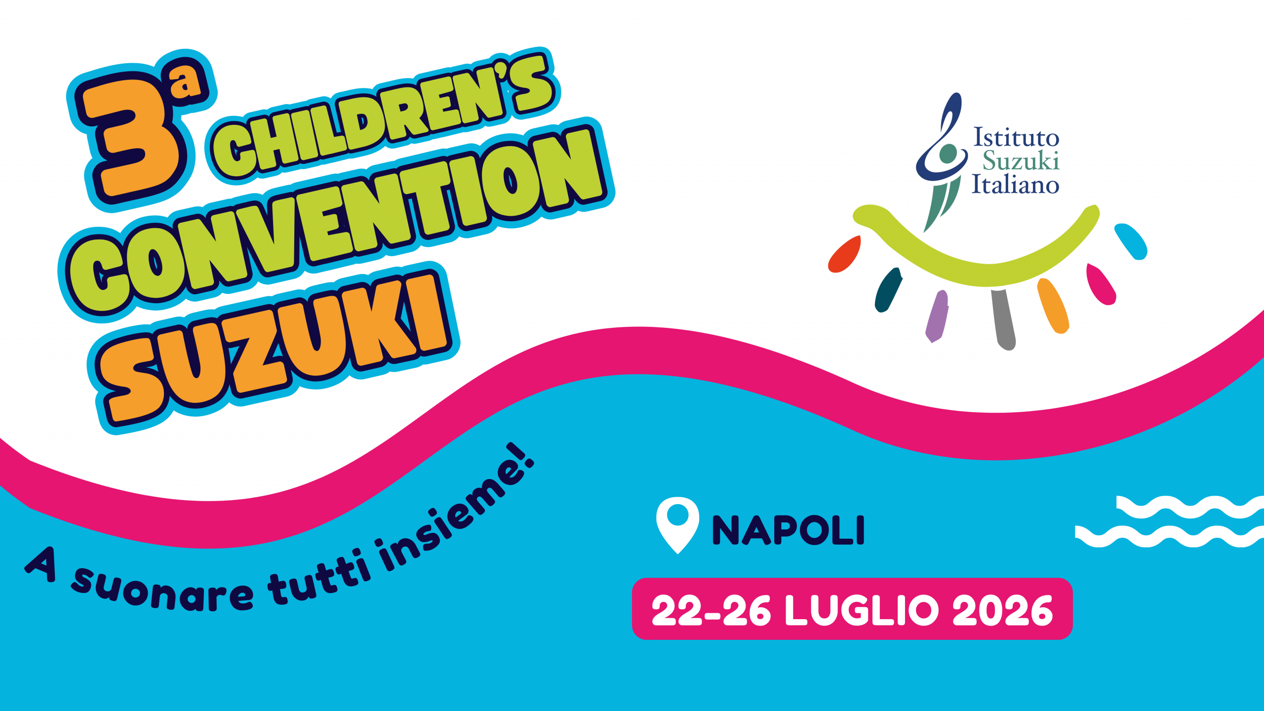 Dal 22 al 26 luglio 2026 tutti gli allievi Suzuki d’Italia e i loro Maestri si ritroveranno nella città di Napoli per la Convention Nazionale! Lezioni di gruppo, di orchestra, concerti delle Scuole, conferenze, concerti delle Famiglie, laboratori musicali, prove e concerti delle orchestre Nazionali!